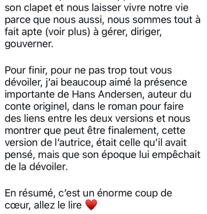 @aforcedelire : « C’était beau, c’était poétique, c’était puissant, et c’était trop bien. Et super original : mélanger les époques et faire se rencontrer Andersen et Brunehaut ? Du génie. Ajouter un soupçon de sorcellerie et du féminisme ? Un régal. »