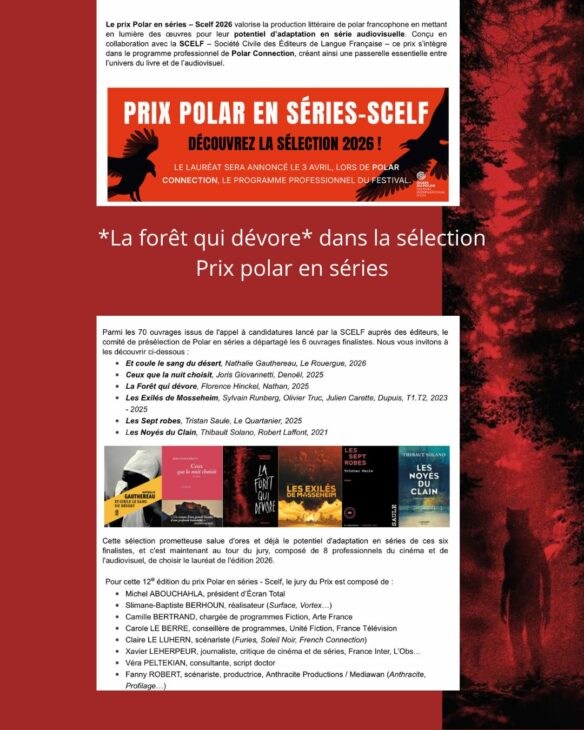 *La forêt qui dévore* est dans la sélection du prix Polar en séries-Scelf, qui distingue des ouvrages pour leur capacité d’adaptation en série.